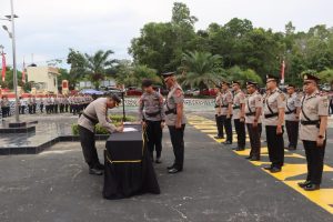 NUNUKAN- Kapolres Nunukan AKBP Taufik Nurmandia, S.I.K., M.H., pimpin Serah Terima Jabatan Kasat Intelkam, Kasikum, Kasat Tahti, Kapolsek Sebatik Timur, Kapolsek Krayan Selatan, Kapolsek Sebuku, Kapolsek Lumbis dan Pengukuhan Kapolsek Sembakung Polres Nunukan. Bertempat di lapangan Apel Polres Nunukan, Sabtu (12/08/2023).